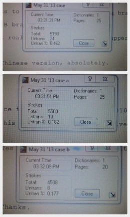I’m including a snapshot of my translation statistics for this case. I had to break it down into 3 sessions for the day since my student version of the software can only go up to 50 page as at a time and I usually end and begin a new file after a recess and lunch break. This ensures that I have a full 50 pages to go after every recess/lunch. I think I wrote very clean. On average, my translation statistics for the whole day was 0.00276 which meant my accuracy rate was 99.7%! Of course, I had some drops here and there, but I would say on the overall, that’s a great stat. 🙂