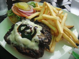 A 100% angus beef burger topped with portobello mushrooms, swiss cheese, and balsamic glaze.