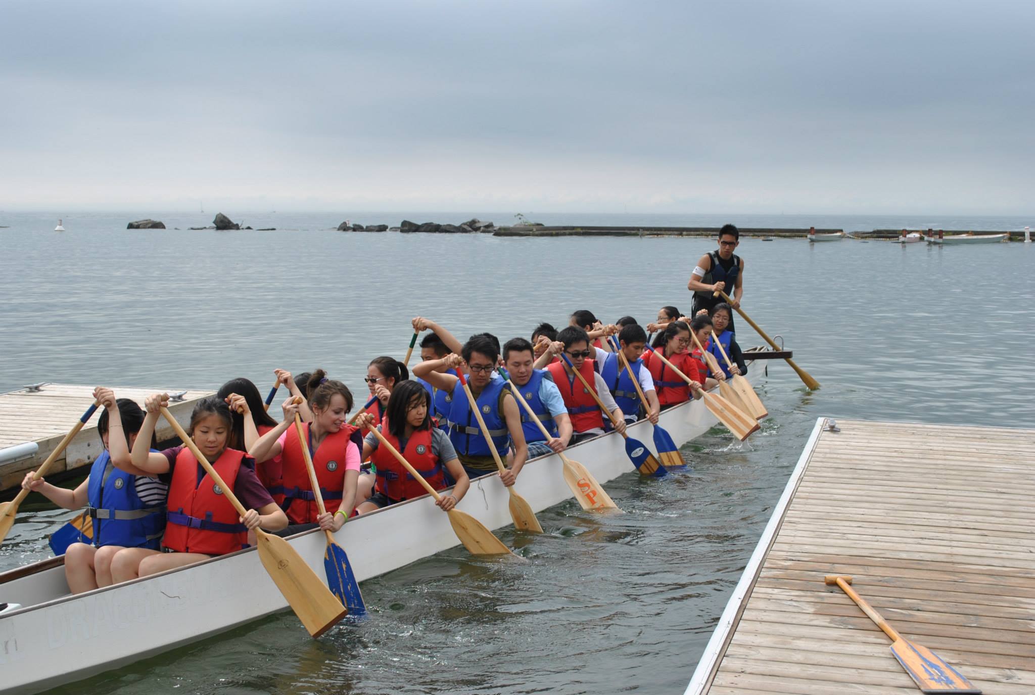 This past Saturday in the DiSCOVER 2013 program, instead of sitting in the classroom in our usual Mandarin class and business/Chinese culture workshop, we went out to the lake shore and did a 2-hour crash course on the wonderful water sport of dragon boating. I’ve seen people dragon boat many times and ate those lotus-wrapped rice balls during Dragon Boat Festival but never had the inkling to try it out for myself. We spent the first part of the hour warming up, doing stretches, and jogging on the boardwalk. It was a really cool and gloomy morning.