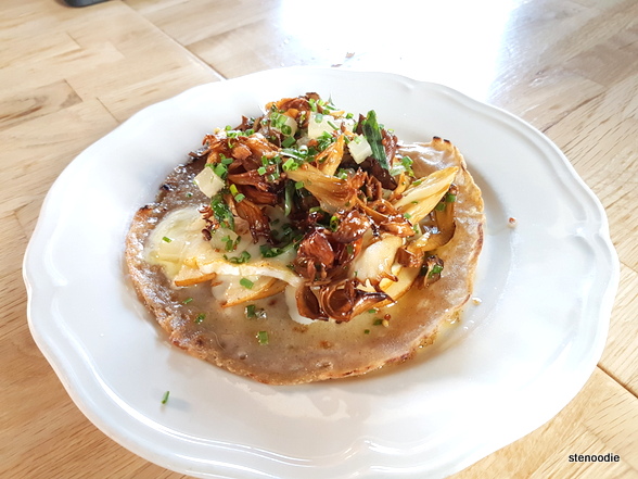 The first dish to arrive was our appetizer, the Mushroom & Taleggio Crêpe. This was a beautiful layered dish. I didn’t expect the crêpe to look like this at all! It had hazelnut crema, bartlett pear, and maitake mushroom. I tasted the mushrooms as well the thinly sliced potatoes and pears. It was definitely a unique dish that I’ve never had before. This was my favourite appetizer of the night!